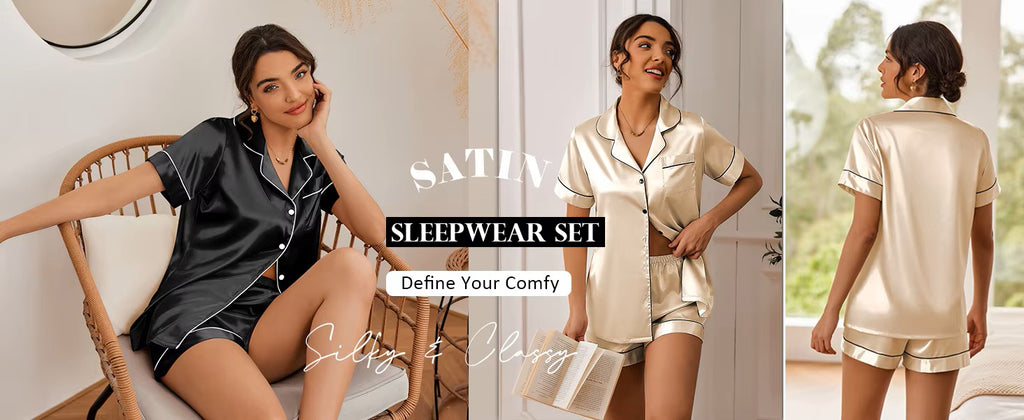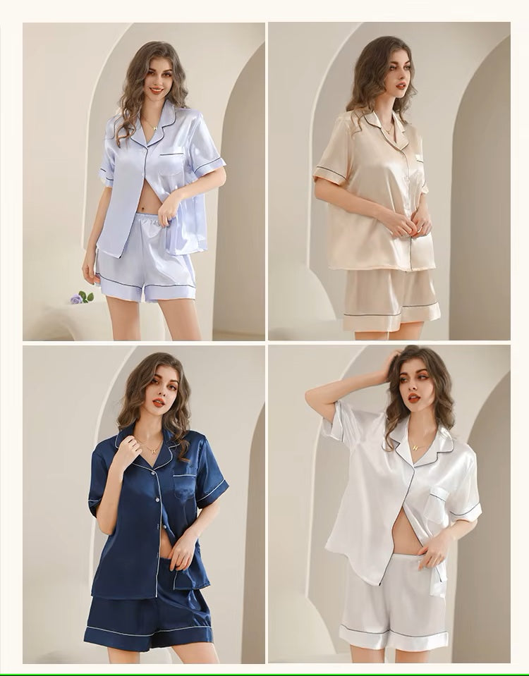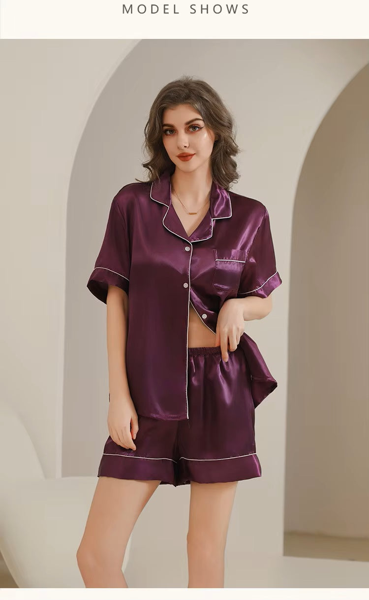 Indulge in luxurious comfort with this silky satin sleepwear set for women. The lightweight and thin blend of Polyester and Spandex drapes beautifully and feels incredibly smooth against your skin. This set includes a classic button-up shirt with a lapel collar and matching shorts, both in solid colors, designed for a relaxed and comfortable night's sleep.